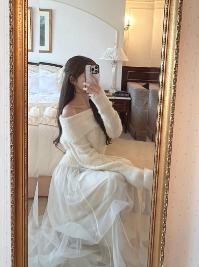 約會必備~~超仙氣!! 露肩毛毛針織上衣l連薄紗裙套裝 [ru1201]